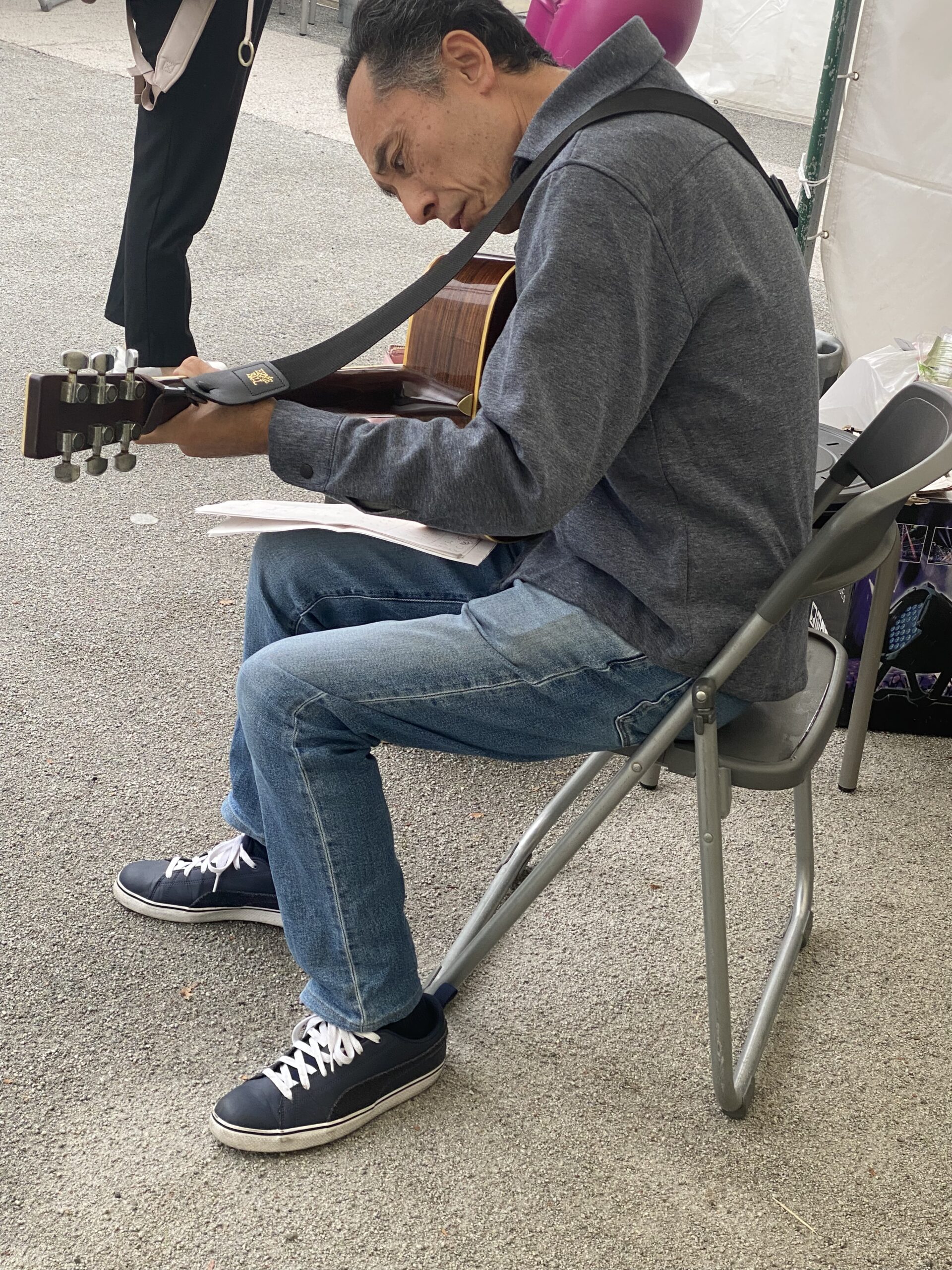 出番直前のKAZAYAさん。コードを入念にチェック!