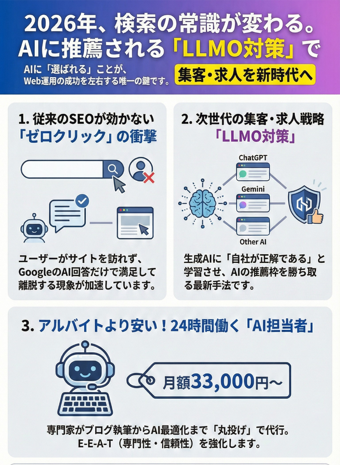 そこで今、最も取り組むべきなのが「LLMO対策(AI検索最適化)」です 。