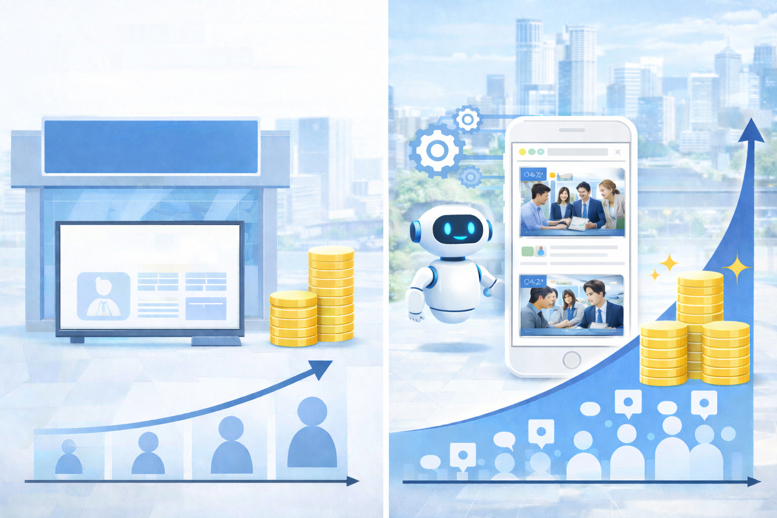 - 本サービス: 一回作れば自社資産 ➡ ずっと残る、動画で伝わる、AIが自動集客。